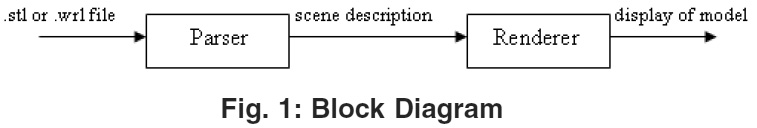 The block diagram figure 1, explains the process carried out in this work. The .stl or .wrl file, which contains description about the object, is given as an input to the program. Parser code stores these details in data structures. Information contained in data structure displayed as object on the screen using OpenGL commands.