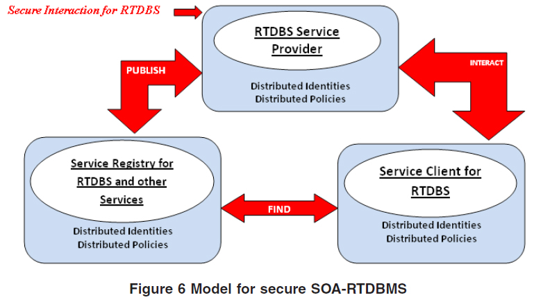 We add the security elements to the Basic SOA in Figure 1. This produces the model in Figure 6 (adapted from (CSI/FBI Computer Crime, 2006) and (seduhkin, 2003) for a secure RTDBS in SOA. This is not a model for an implementation of a RTDBS-SOA. When implementing RTDBS in SOA, one should implement a security system that takes care of all the policies, manages the identities and provides secure interaction.