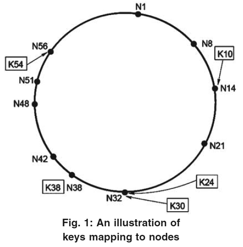 In Chord, both nodes and keys are given numerical identifiers. The identifier for a key is obtained by hashing that key with some hash function that is used by all of the nodes in the system which returns integers of some bit length m. A node is assigned an identifier by hashing its IP address. Nodes and keys are then arranged in an identifier ring modulo 2m. Each key’s value is stored on thefirst node with an identifier equal to or following that key’s identifier in the ring. This aspect is illustrated following Fig. 1.
