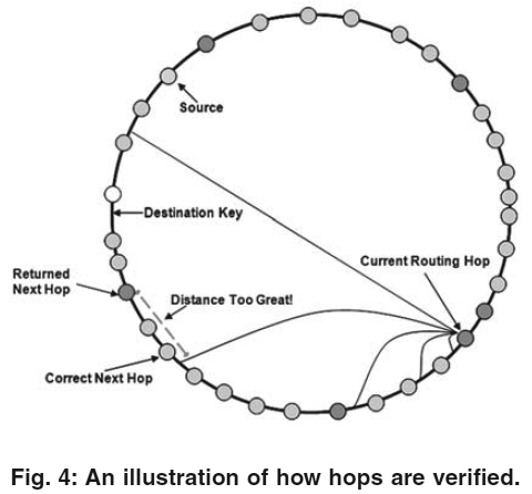 - Each hop will be verified for probable correctness by checking the numerical difference between node identifiers in the hop to statistical information about network density derived from the finger table of the node performing the lookup.