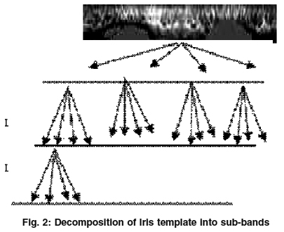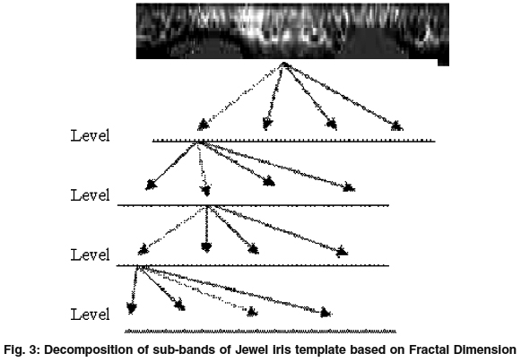 decomposition oftemplate into significant sub-bands using 5 level Haar wavelet based on fractal dimension (c) extraction of feature vector using statistical features of sub-bands (d) Classifications, both probabilistic andnon probabilistic classifiers such as Bayes, Euclideanand K-Nearest Neighbor are used for classification of iris templates.