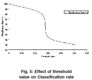Fractal dimensions of iris template (Flower iris) at different levels of decomposition are shown in Table 1. The best classification rate is achieved at 8 levels with overall performance above 98% a shown in Table 5. Table 3 depicts the variation in accuracy with respect to change in threshold value( 100% and 90% for threshold values of λ= 0 and 0.05 respectively). A comparative study is also performed with conventional statistical features of co-occurrence matrix. The optimal threshold value is set to 0.02 (chosen empirically) to achieve more than 95% accuracy.