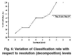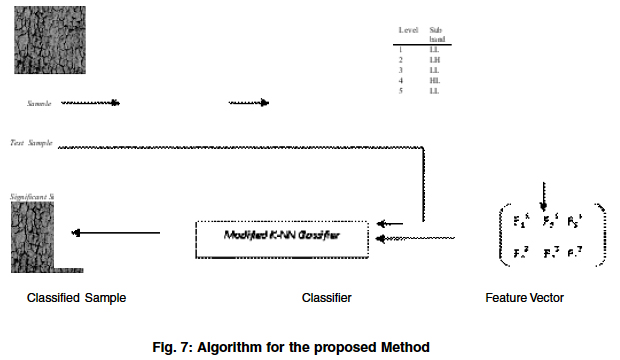Significant co-occurrence features from original images without decomposition which are used for classification in traditional approaches are also shown in Table 4. Table 6 gives the performance of different classifiers when compared with modified K-NN classifier. It is shown that modified K-NN classifier has 100% performance at 8 levels of decomposition and at 6 levels it is 98%. 100 % classification rate is achieved for flower and jewel Sub-bands from Haar wavelet Classified SampleClassifierFeature Vector iris templates due to their rich texture properties while stream and shaker exhibit above 95% classification rates.