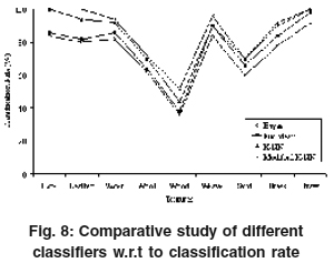 Both the probabilistic and non probabilistic distance measures such as Bayes, Euclidean, and ordinary K-Nearest Neighbor16 are used for comparative study.