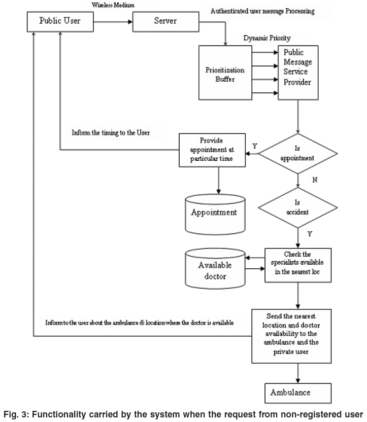 The operation shown in Figure -4 is performed when the message from non-registered user. First the server identifies whether the incoming message is for requesting appointment from doctors or conveying about the accident. If the message is for fixing appointment, then the public service message provider identifies the availability of doctor and the timing is assigned for the patient and the reply to the public user immediately and makes an entry in the appointment database too. The appointment database deletes all the records once in every 24hrs.