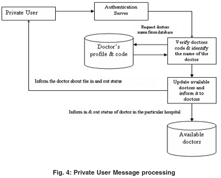The proposed framework is implemented as prototype in JAVA. User has being accessed the framework through mobile, laptop and desktop. Mobile device is used to send and receive the information as SMS from the framework. User can get all types of information such as doctor list, patient details, status of patient etc through Web. The messages from public users are also processed in this health care system after some verification. If the message indicates about the accident, based on the human organ damaged, the health system filters the specialists and identifies the nearby doctor available and directs the ambulance to go to the accident spot, then specifies the nearest doctor’s availability and makes the ambulance to go to that nearest hospital immediately. The following operation in Figure -3 is performed when the message is from the private user. The server retrieves the name of the doctor from the doctors profile database. If the message from the private user specifies that the doctor is entering into the hospital, then the server updates the doctor with the public user message, particular password status as ‘IN’ in the available doctors Database, so that when the private message service identifies the availability of the doctor in the nearby location. If the message from the private user specifies that the doctor is leaving the hospital, then the server updates the doctor with particular password status as ‘OUT’ in the Available doctors Database, so that when the private message service provide filters the n on available doctors from the process of allocation.