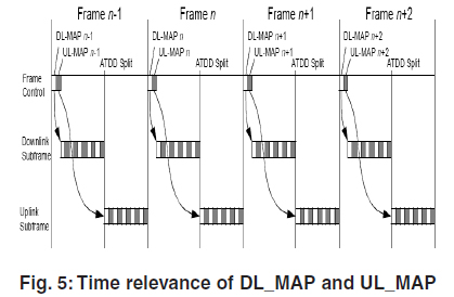 The model currently supports TDD. In this mode, uplink transmission occurs after downlink in each frame. The DL_MAP and UL_MAP messages sent every frame defines the burst allocation and transmission opportunities for each station. The information contained in the UL_MAP belongs to the same frame as shown in Figure 5.