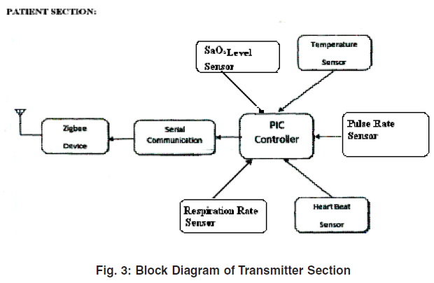 The researcher first chose the proper sensor for the above application to convert the physiological signals into electrical signal which is in the form of analog signal. This analog signal was converted into digital signal by designing a proper circuit. This digital signal was fed into the PIC controller. The output of this PIC controller is fed into the serial communication circuit. The output of this serial communication circuit is fed into the zigbee device and output of this zigbee device is transmitted via transmitting antenna. In the receiver side the said transmitted signal is received through the receiving antenna and fed into the zigbee unit. The output of this zigbee unit is fed into the RS-232 serial port communication interface and output of this RS-232 is fed into personal computer (PC) sends global system for mobile communication (GSM) short message to the receiver. The receiver can use the PC or personal digital assistant (PDA) to observe the sensed signals in the remote place.