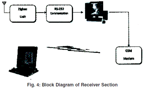 As shown in the under mentioned figure in the receiver side the said transmitted signal is received through the receiving antenna and fed into the Zigbee unit. The output of this Zigbee unit is fed into the RS-232 serial port communication interface and output of this RS-232 is fed into personal computer (PC) which can be data collection. This personal computer (PC) sends global system for mobile communication (GSM) short message to the receiver. The receiver can use the PC or personal digital assistant (PDA) to observe the sensed signals in the remote place.