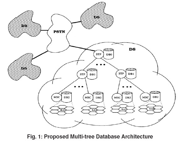 The proposed database system is a multi-tree structure, consisting of a number of distributed database subsystems (DSs), each of which is a three-level tree structure. In each DS, databases DB0 and DB2 may correspond to the HLR and the VLR in the two-level database system, respectively. Each DB1 has an entry for every currently residing user, storing a pointer to the DB2 the user is currently visiting.
