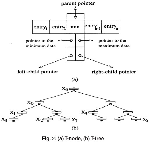 The T-tree, which evolved from the AVL-tree and the B-tree, is a binary tree in which each node called T-node contains a number of data items, a parent pointer, a left-child pointer, a right-child pointer, and some other control information. The T-tree is fast since it retains the intrinsic binary search nature of the AVL-tree. On the other hand, unlike the AVL-tree that holds only one data item in each node, the T-tree contains a number of data items in each node similar to the B-tree, thus having good storage utilization. In a T-node, the data items are arranged in increasing order of their keys. To find a value in the T-tree, a search algorithm for the T-tree is needed. According to, one efficient search algorithm for the T-tree can be described as follows: