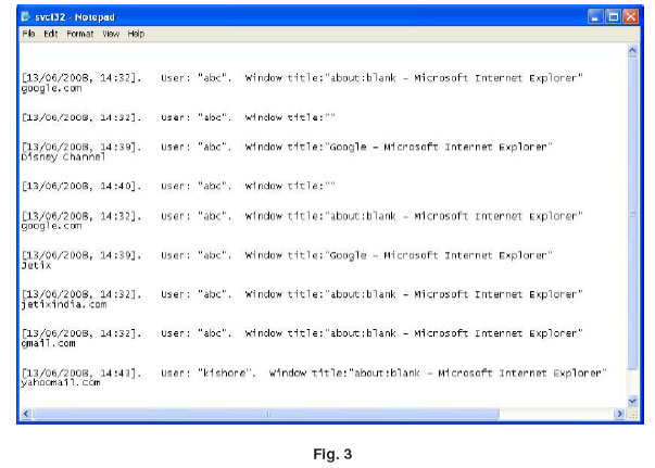 Fig. 3 shows sample format for how the data are recorded in the keylogger file. The file may contain the username and passwords and credit card number information, e-mail ids, phone numbers, account numbers, personal information and other sensitive data. They are lot of freeware also available in the market. Keyloggers has an option to send logging files to e-mail ids. If may it works as a hacking the information, the entire confidential data send to another person. That is, passwords, credit card numbers and other sensitive data. But still the user or secure system cannot identify the program hacking the data. Because