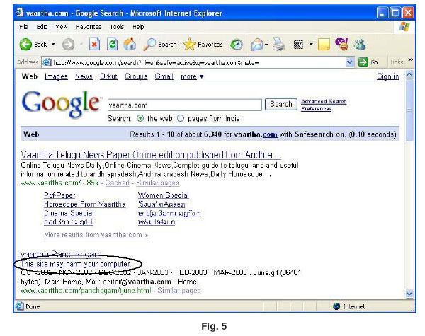 We have lot of security programs but most of the programs cannot protect the system while they are accessing any websites. If the user confused about the website. Then lot of searchengines provides the messages about un trusted sties. For example The google search-engine provides this facility for the net users. When the site is untrusted the google message that “This site may harm your computer”.The Fig. 5 is shown the example for this situation.