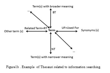 The thesaurus is the least formal form of an ontology. According to lexical criteria, a thesaurus provides the possibility to organize the words used in a certain domain. Language-specific dictionaries that also encode information about synonyms or a classification of medical terms for diseases are examples of a thesaurus. The Thesauri expressivity is low in terms of logic-based knowledge representation and is restricted to lexical relations between words, such as synonymity or homonymity (Example of word net). Figure 1 illustrates an example of a thesaurus related to information searching.