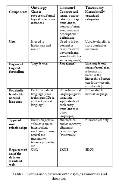 This section provides a comparison between three languages of knowledge representation (ontologies, thesauri and taxonomies). The ontology is useful to describe the world as it is; the thesaurus is adopted to facilitate access to content; the taxonomy is constructed to classify resources in folders and categories. The content, data or knowledge access systems combine and articulate these three organizational systems to describe the world, index, and categorize content. The comparison illustrated in Table 1 take into accounts the properties of domain modeling components, degree of logical formalism, the proximity level with natural languages, the types of relationships used and an example of data representation.