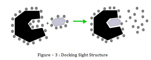Above figure shows the molecular docking process. In this process protein target is represent in black color and a drug candidate or ligand is represent in grey color. In above figure, the curve like structure in the target is the active site upon which the drug attaches. The active site is also called the binding pocket. The active site of protein can be viewed as a lock, and the ligand can be as a key. This figure shows that the molecular docking is the process of testing whether a given key fits a particular lock.