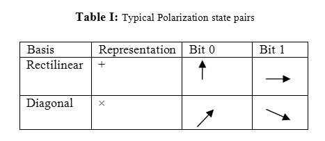 Say Alice sent one photon polarized to a (–) spin to Bob, and Eve interrupts the photon. But Eve has mistakenly chosen to use an X filter to measure the photon. If Bob randomly (and correctly) chooses a + filter to measure the original photon and finds it’s polarize in either a (/) or ( ) position. Bob will ensure the filters only after communicating with Alice, till then he believes that he has chosen an incorrect filter. After acknowledging all the photons, Bob will communicate with Alice about the filters used to resolve the polarizations. If Eve intercepts the message then it results in inconsistency. In the example of the (–) photon that Alice sent, Bob will inform that he used a + filter. Alice will let him know that it is correct, but Bob will recognize that the photon he received did not match to original ((–) or (|)). Due to this difference, Bob and Alice will know that their photon has been changed by Eve, who involuntarily changed it. The polarization state pairs are shown in table I.