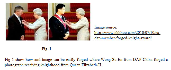 Figure 1: show how and image can be easily forged where Wong Su En from DAP-China forged a photograph receiving knighthood from Queen Elizabeth-II.