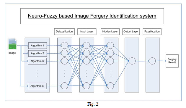 The proposed system will utilize advantages of different algorithms. The forged image is sent to different algorithms which then analyzed result is then given in the form of whether the image is forgered according to that algorithm of not. The fuzzification of this true-false values are done before inputting to input layer of the Artificial Neural Network (ANN). Inside the ANN different weights are assign to different connections and accordingly knowledge has been generated at the output layer of ANN. Lastly defuzzification of the output knowledge is been done to provide yes-no answer to the user.