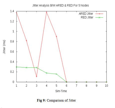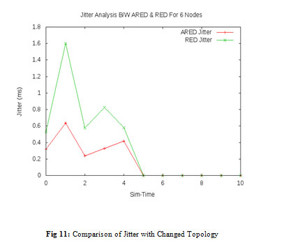 An additional node has been added so to further testify the jitter. The jitter of ARED is less as compared to that of RED which is there as a result of additional node. It clearly indicates that earlier network configuration suffered from the problem of congestion and it was the presence of this congestion which hampered delay results of ARED.