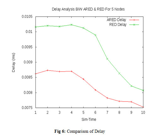 For reliable transfer, the per-packet transfer time seen by the application includes the possible delay of retransmitting a lost packet. Figure 6 shows the graph of Delay in both ARED and RED. Delay in a network is defined as how long it takes for a bit of data to travel across the network from one node to another. The delay is measured in millisecond (ms). The delay for ARED is 0.0075 ms whereas that of RED is 0.008 ms. It is known that lesser is the delay, better is the network performance.