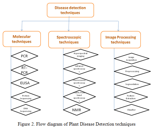 In spite of availability of these techniques, there is a demand for a fast, sensitive, and selective method for the rapid detection of plant diseases. In the present review paper, molecular methods and spectroscopic methods of plant disease detection are not discussed in detail as a number of review papers are available in the literature, we are focusing on image processing techniques and describing more in details.