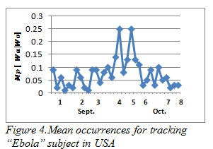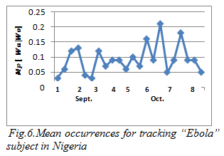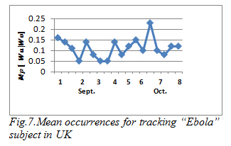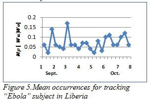 Figures 4 – 7 show the pattern for the occurrence of ebola (a pandemic disease) in USA, Liberia, Nigeria and UK respectively. We noticed that the occurrence of the theme was more stable with close range values in Liberia than in any other place; this could be as a result of the persistence of the disease. In US, there was a peak occurrence between the fourth and sixth week. The peak occurrence in Nigeria can be seen between the sixth and eighth week (October), which was about the time the first case was diagnosed. Similarly, in USA the occurrence reached its climax at about the fourth and sixth week, this could be as a result of the possibility of the disease getting into the country.