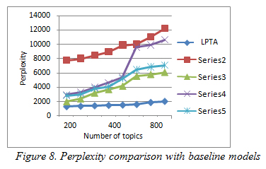 The evaluation of our system (STPS) is based on measurable baseline of metric of perplexity. A brief about the baseline are as follows: Location Aware Topic Model (LATM) (Wang et al., 2007), Latent Periodic Topic Analysis (LPTA) (Williams et al., 2013), Latent Dirichlet Allocation (LDA) (Blei et al., 2013), Spatiotemporal Theme Pattern model (STTP) (Mei et al., 2006) and Topics-Over-Time model (TOT) (Wang and McCallum. 2006). These metrics measured the generalisation performance of a model, the ability of a model to generalise to unseen data.These metric measures the generalisation performance of a model, that is, the ability of a model to generalise to unseen data. The results from the baselinesare adopted from Jiang and Hung (2013), and a corresponding setup of dataset is used in our research,the lower the perplexity measure, the better the generalisation performance. We set up an eight validation pre-set data to compare the models. Figure 6 shows the average perplexity of each model when the topic amount is set to different values. From the graph it is observed that when the topics is 500, the perplexity of STPS is 1502, while TOT, STTP, LATM and LPTA are 9885, 4180, 5398 ,5264 respectively.